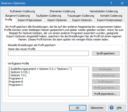 Auf dieser Registerkarte können Profile mit bestimmten Gedcom-Optionen gespeichert und geladen werden. Ein Profil speichert alle Einstellungen, die auf den anderen Registerkarten vorgenommen wurden. Es können beliebig viele Profile unter eigenen Namen gespeichert und geladen werden. Vom Anwender gespeicherte Profile können auch umbenannt und gelöscht werden.