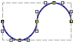 Dieses Beispiel wurde mit sechs normalen Mausklicks und einem abschließenden Mausklick (bei gedrückter Steuerungstaste) erzeugt. Der erste und der letzte Hauptpunkt liegen beide am linken Rand nicht übereinander; sie wurden daher automatisch mit einer Geraden verbunden, um die Kontur zu schließen. Das Beispiel zeigt auch, dass sich die Kurven kreuzen dürfen und auch mehrere eingeschlossene Flächen farbig gefüllt werden.