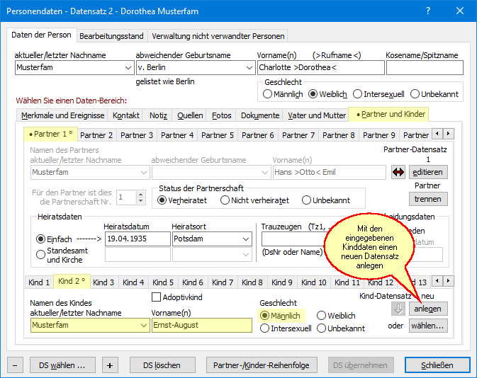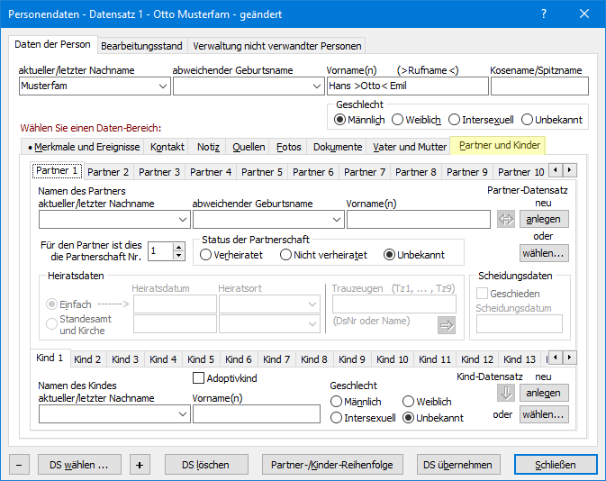 Zur Eingabe der nächsten Person, eines Verwandten, wechseln Sie nun auf die Unter-Registerkarte Partner und Kinder: