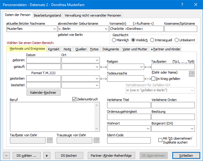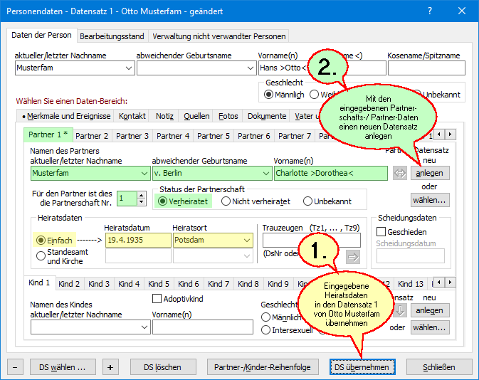 Beachten Sie, dass jetzt auf dem Reiter Partner 1 zusätzlich ein Sternchen * (für Partnerschaftsdaten geändert) steht, dass in der Fenster-Titelleiste zusätzlich geändert steht, und dass außerdem die Schaltfläche DS übernehmen aktiviert wurde. Dies hat folgende Ursache: Die Eingabe von Heirats- oder Scheidungsdaten betrifft nicht nur die neu anzulegende Ehefrau, sondern auch den bereits angelegten Ehemann (siehe in der Titelleiste: Datensatz 1 - Otto Musterfam - geändert). Also müssen diese Daten für den Ehemann zunächst mit DS übernehmen übernommen werden. Anschließend klicken Sie rechts von den Namens-Eingabefeldern des Partners auf die Schaltfläche Partner-Datensatz neu anlegen. Damit wurde der Datensatz Nr. 2 angelegt, für den nun die Unter-Registerkarte Merkmale und Ereignisse angezeigt wird; in der Titelleiste steht deshalb jetzt Datensatz 2 - Dorothea Musterfam:
