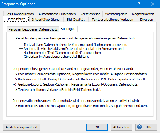 Auf der Unter-Registerkarte Sonstiges kann im Bereich Regel für den personenbezogenen und den generationenbezogenen Datenschutz eine spezielle Option eingestellt werden: Hier kann bei aktivem Datenschutz die Ausgabe von Vornamen und Nachnamen freigegeben werden. In solchen Fällen werden also die Vornamen und Nachnamen ausgegeben, aber alle anderen geschützten Daten werden unterdrückt. Wenn dieses Kontrollfeld nicht markiert ist, wird anstatt der geschützten Namen der Ersatztext Namen geschützt ausgegeben; dieser Ersatztext kann im Ausgabesprachendatei-Editor geändert werden.