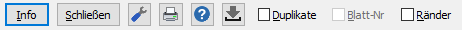 Die Schaltfläche Schließen schließt die Druckvorschau. Es folgen Symbolschaltflächen zum Öffnen der Baumansichts-Optionen, Registerkarte Drucker-Seite, zum Drucken, zum Aufruf der Hilfe und auf Tablett-PCs eine Symbolschaltfläche zur Aktivierung des roten Mauszeigers, der durch freie Objekte hindurchsehen kann.